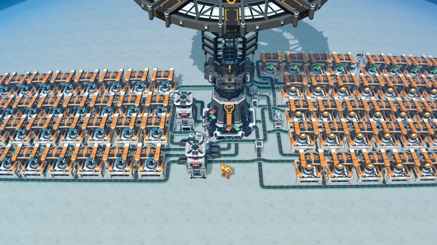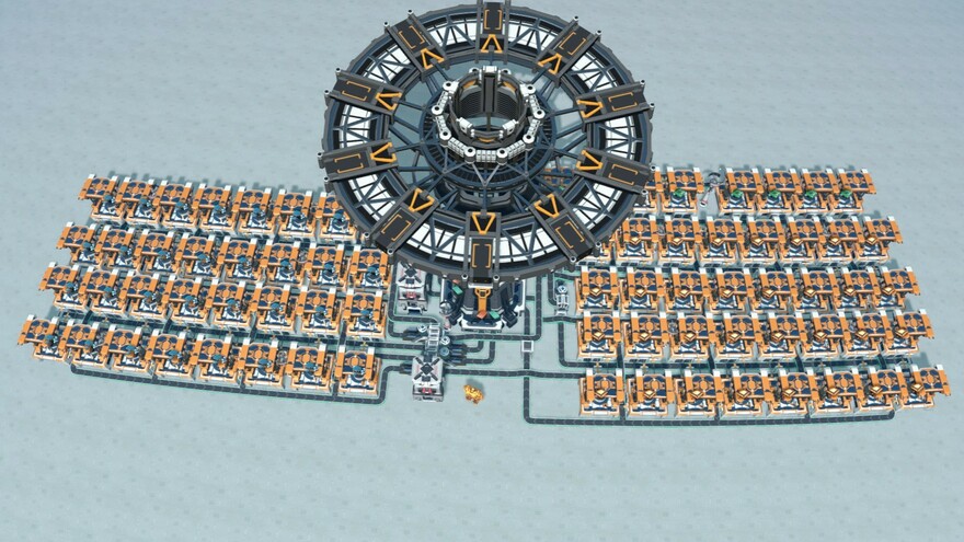 Blackbox module producing Processors from Ingots at a base rate of 360/min. Optional warp capability and Proliferator is added via Logistics Bots. Production can be easily scaled by up to 6.25x (to 2250/min) by upgrading Assembling Machines, Conveyor Belts, and Sorters, and adding Proliferator. Full output requires Station Integrated Logistics Lv1 research. Ideally placed between 30-45 degrees latitude, where it consumes 7.5 degrees of latitude (i.e. half the vertical space of the tropic) and 36 degrees of longitude (i.e. 2 sectors). Includes a Traffic Monitor set to 150/min on one production line to alert if production is disrupted.
