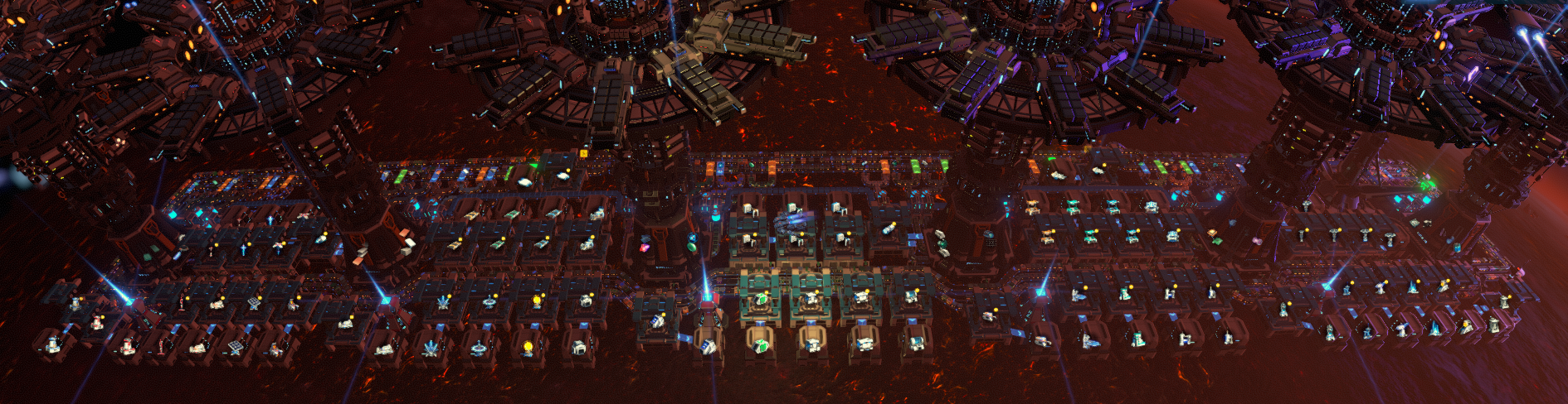 Compact mall, makes every building in the game + drones + vessels, proliferates all inputs, 25x150 footprint