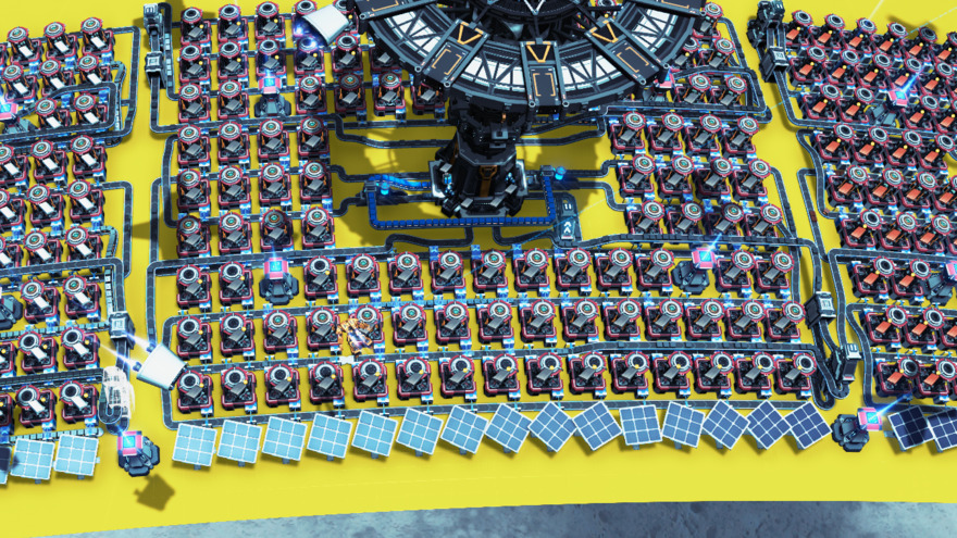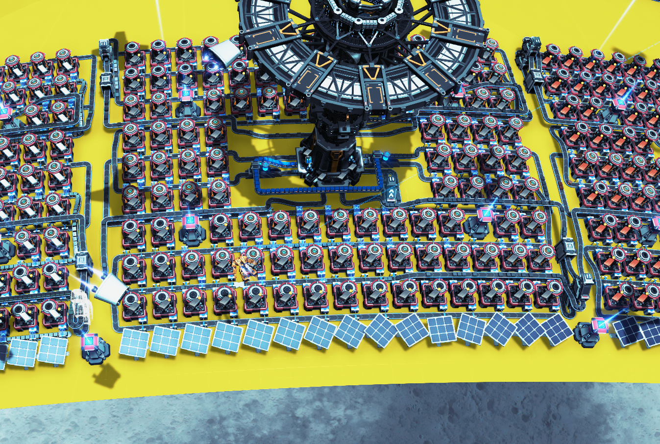 Compact smelting block design. Works well at the beginning of the late-game stage when you want to scale up your production but not yet at the planet-per-resource phase. With 40x50 space, you can stack it up to 4 high per sector in the equatorial zone (20x around the planet), and one block per sector in each of the adjacent 50-tall zones when rotated 90 degrees.