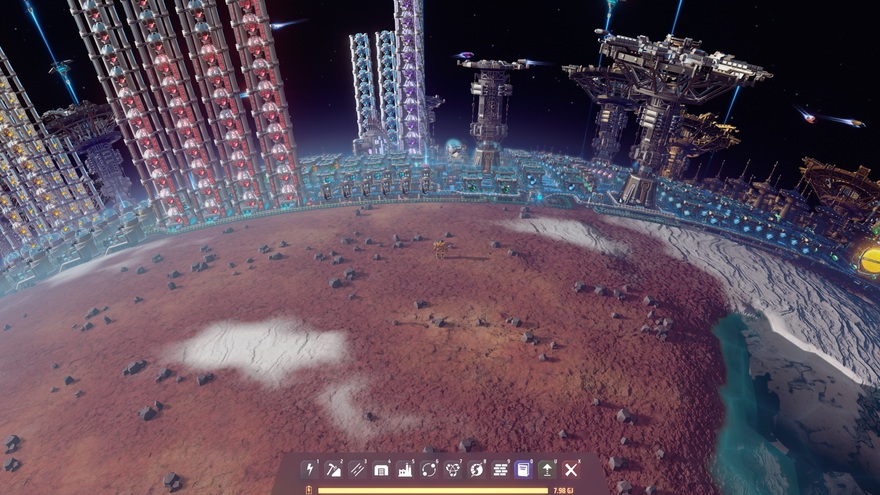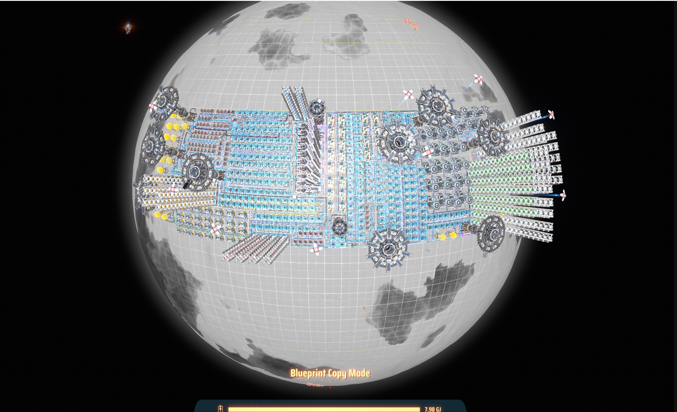 - Remote space warper, antimatter fuel and proliferator is required to jump-start the factory - All inputs are raw - Proliferator, space warper and fuel is all made inside the factory - Everything is proliferated - It's completely tilable, taking 1/4 of planet's middle area (between lognest yellow lines) width and 1/2 height, so you can put 8 of them on a planet. - Critical photon and deuterum produced/mined off-site.