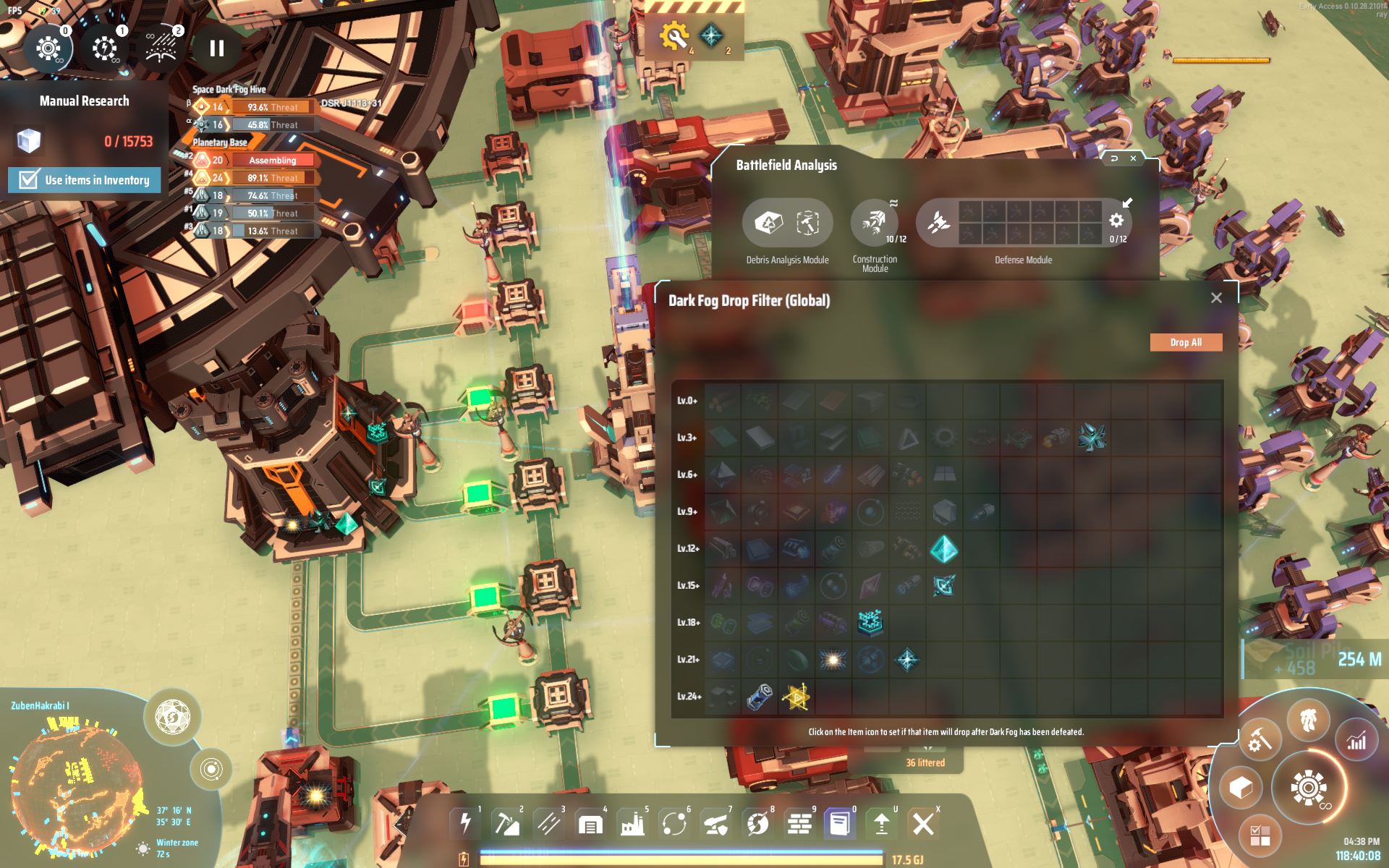 How it works: The laser turrets do most of the work which ensures you don't need to keep up a burdensome production line of ammo. The Implosion Cannons are set back where they fire if Dark Fog get too close. They are helpful with splash damage to take care of large groupings. Ammo usage is minimal. The Battlefield Analysis bases repair the buildings and collect the Dark Fog debris. That debris is deposited onto the belt loop which filters out valuable items. The highest volume items are collected into an Interstellar Logistics Station where the rest can optionally be loaded into boxes and logistics distributors can transport them elsewhere. The warp collector box is intentionally separate because connecting it to the station seems to clog the system.