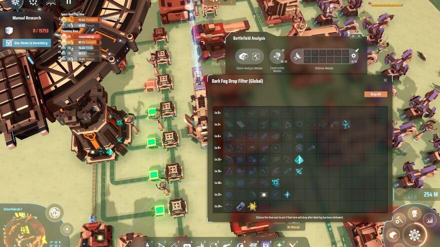 Use the filter to exclude items you don't want. In the Battlefield Analysis Base, choose the Drop Filter settings button and right click all of the items you don't want to collect. It is important that items are used or transported away or the system will clog. As you progress through the Dark Fog levels, the box at the end of the belt loop will collect anything excess which accommodates new items which you have not yet filtered as you progress through the Dark Fog levels.