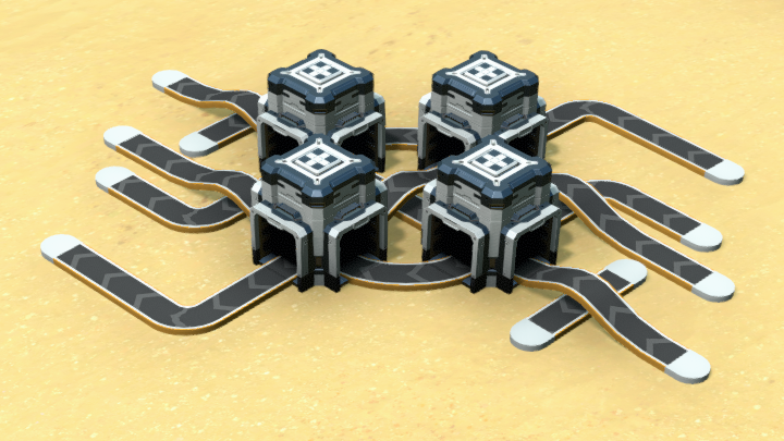 A Diamondistributor with 4 (2^2) inputs and outputs, in 1 (2^0) layer. Recommended to use inputs and outputs in order by distance of their ends from a perpendicular bisector. That is, if they are facing north, then use the northmost OR southmost belts first. Place two of this next to each other for (part of) a T3L0, or stack two of this for (part of) a T3L1.