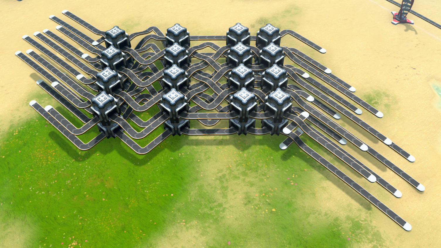 A Diamondistributor with 16 (2^4) inputs and outputs, in 2 (2^1) layers. Recommended to use inputs and outputs in order by distance of their ends from a perpendicular bisector. That is, if they are facing north, then use the northmost OR southmost belts first. Place two of this next to each other for (part of) a T5L1, or stack two of this for (part of) a T5L2.