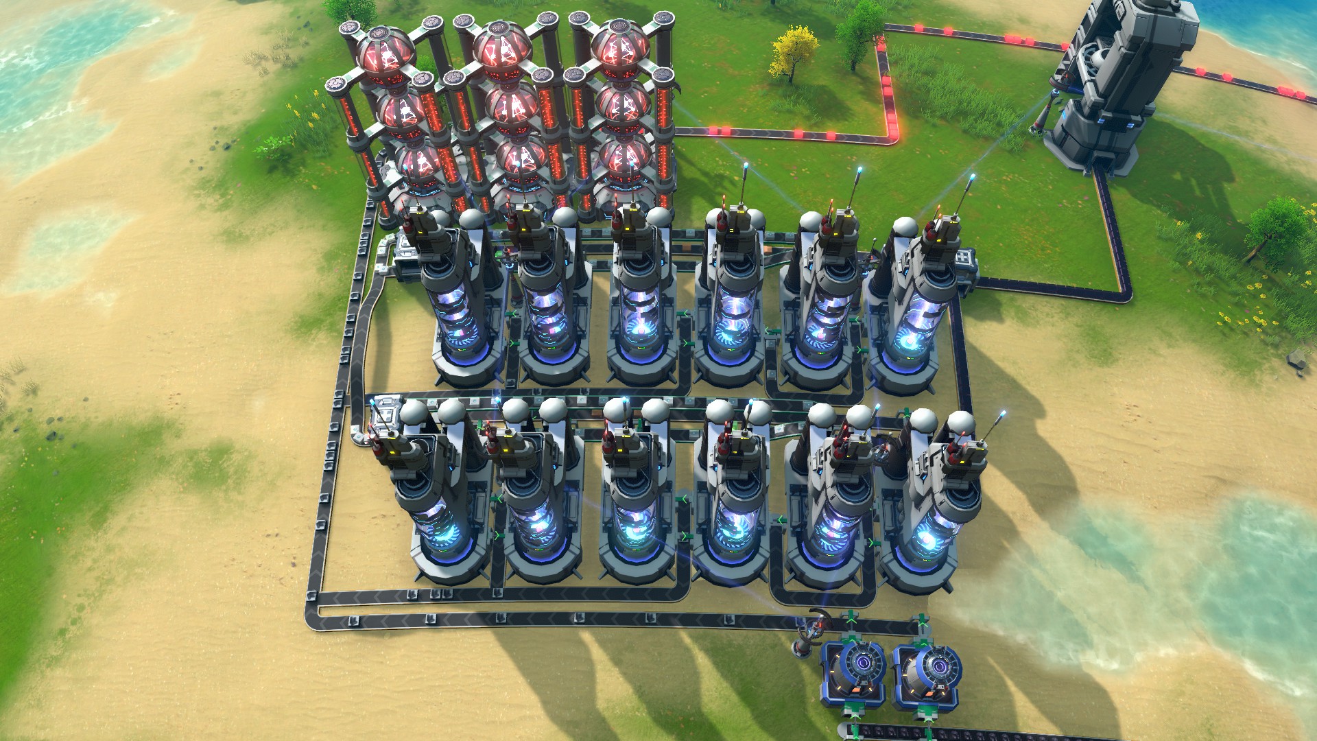 This is the first blueprint I've made that I can be proud of. It hasn't clogged yet, due to the perfect ratios and strategic use of different belt speeds in the hydrogen loop. IMPORTANT: When you first start the factory, you will need to manually clear out the graphite belt to prevent clogging UNTIL the hydrogen production is at full capacity. You can also fill the X-ray crackers with hydrogen initially to avoid this.