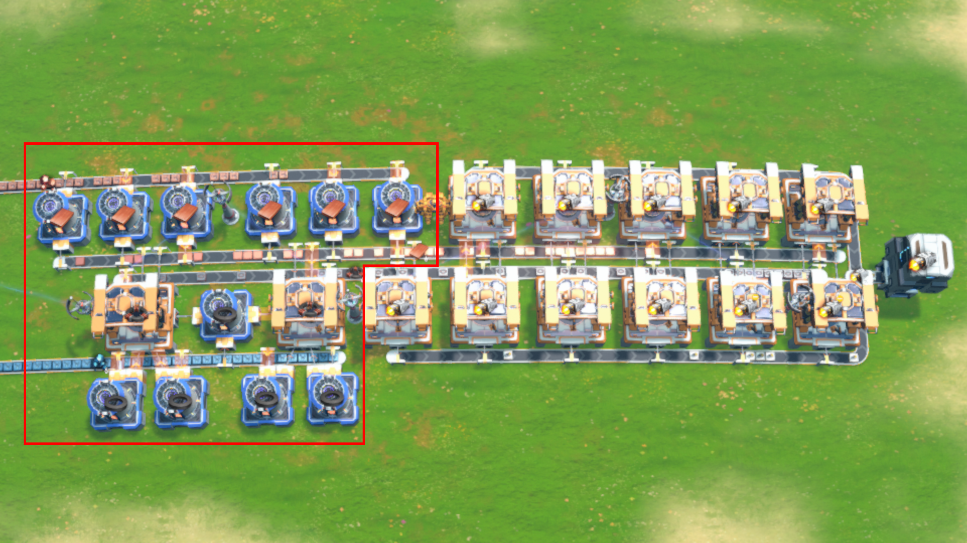 Input: 6 Copper Ore per second (1 full yellow belt) Input: 6 Iron Ore per second (1 full yellow belt) Output: 6 Copper Ingots per second (1 full yellow belt) Output: 4 Magnetic Coils per second (Prepares necessary resources for Engine Production 2 of 2 blueprint)
