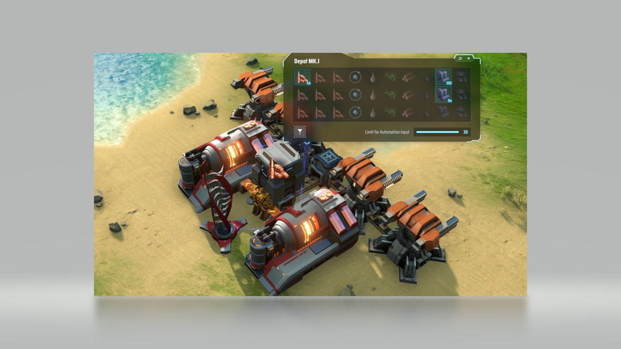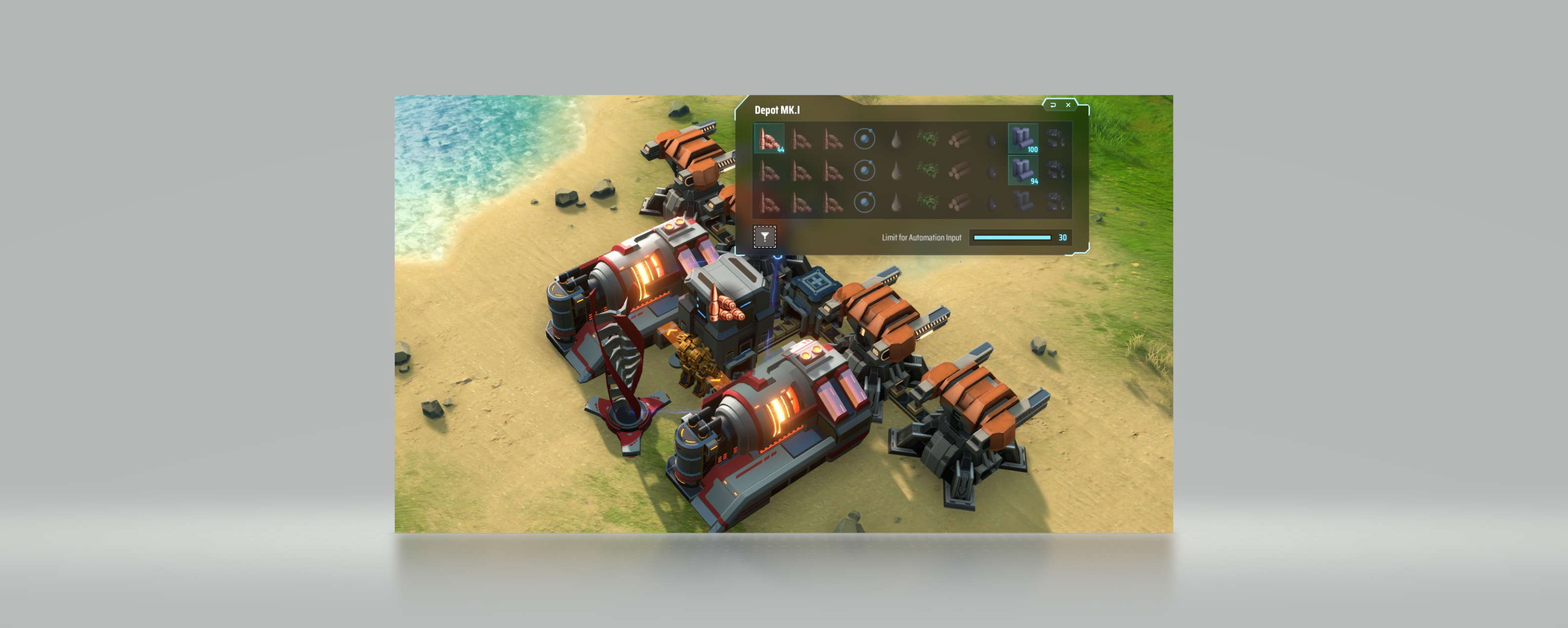 Quad turret base made ready to deploy. Uses a box to automatically insert fuel into the thermal powerplants and distributes ammo. Filters in the box are set for any fuel you might have available. Simply Ctrl click anything you have into the box. This works great for using it as an attack (need 2 or 3 bases to keep up with the spam) It will not destroy an enemy planetary base!