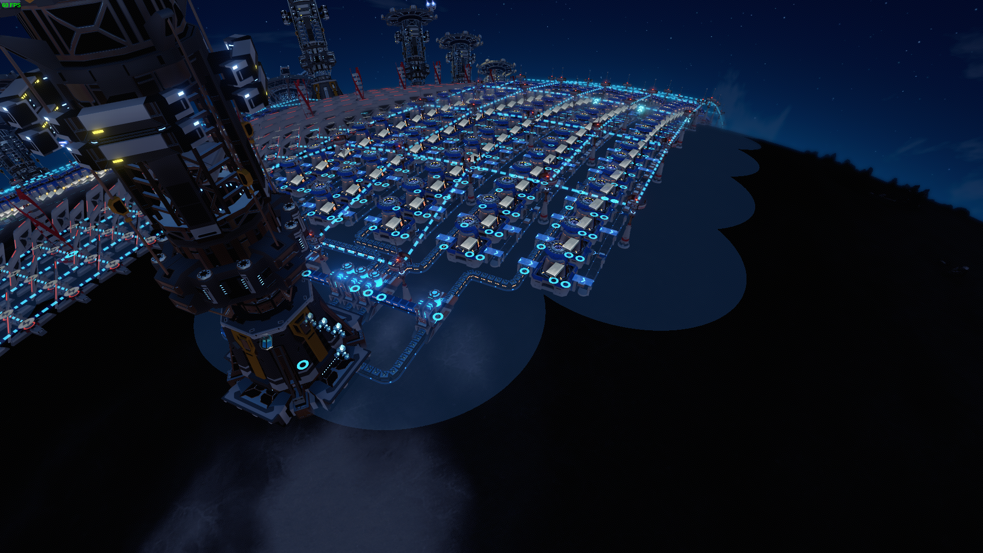 5 lanes of smelters using MK.III proliferator. Should consume ~600 iron ore/sec and produce ~600 iron ingots/sec. There are some issues with the stackers at the end I don't quite understand that makes the output slow down to ~590 iron/sec. Shouldn't be too much of an issue. This design is more power efficient than using plane smelters as plane smelters consume 4x the power draw for 2x the production speed while proliferated arc smelters consume 2.5x the power draw for 2x the production speed. That's a power saving of 40% at the cost of the array being twice the length it could be.