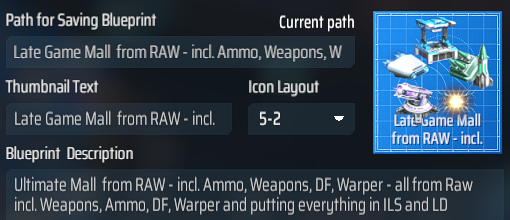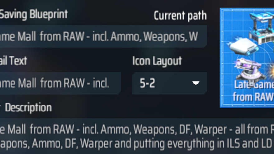 I looked for a Mall that uses endgame buildings and creates all buildings incl. DF, all weapons, ships, warper and ammo ..also I wanted every item shipped via ILS and Logistic