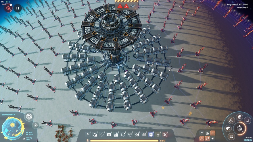 Designed for one fluid imported from off-world and distributed rapidly via 11 belts to a collection of tanks to act as a storage buffer against demand. Ideal for collection of hydrogen or deuterium from gas giants, as it sprays profliferator on the raw incoming ingredients on every belt. Polar installation only.
