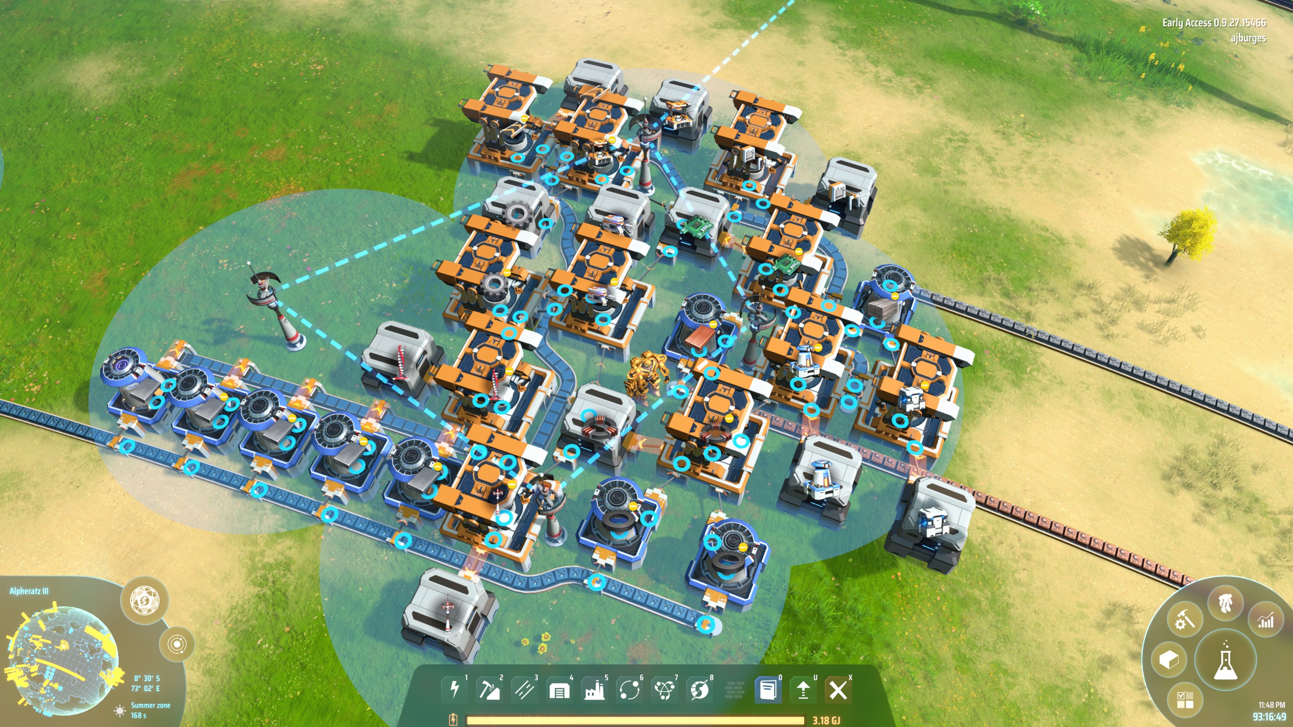 Inspiration for this design came when I noticed the 8 basic buildings represent the different combinations of the 3 basic components (plus iron ingots). If you omit the miner, it is trivial to lay out smelters, assemblers, and storage in a square grid and ditch the belts. Adding the assembler and storage for the miner to that was challenging. I only overcame it when I added storage buffers for the basic components which extended footprints for these linchpin components enough to make the needed connections. Then I tweaked placement to balance sorter length with recipe needs.