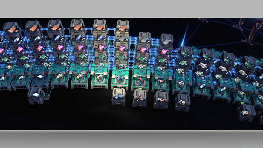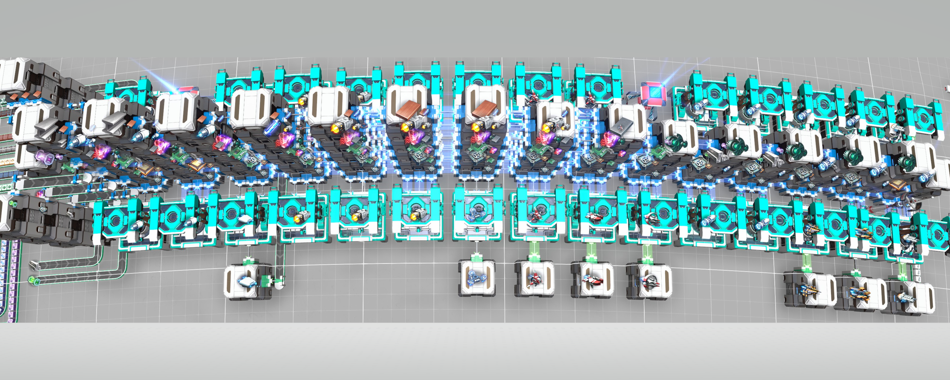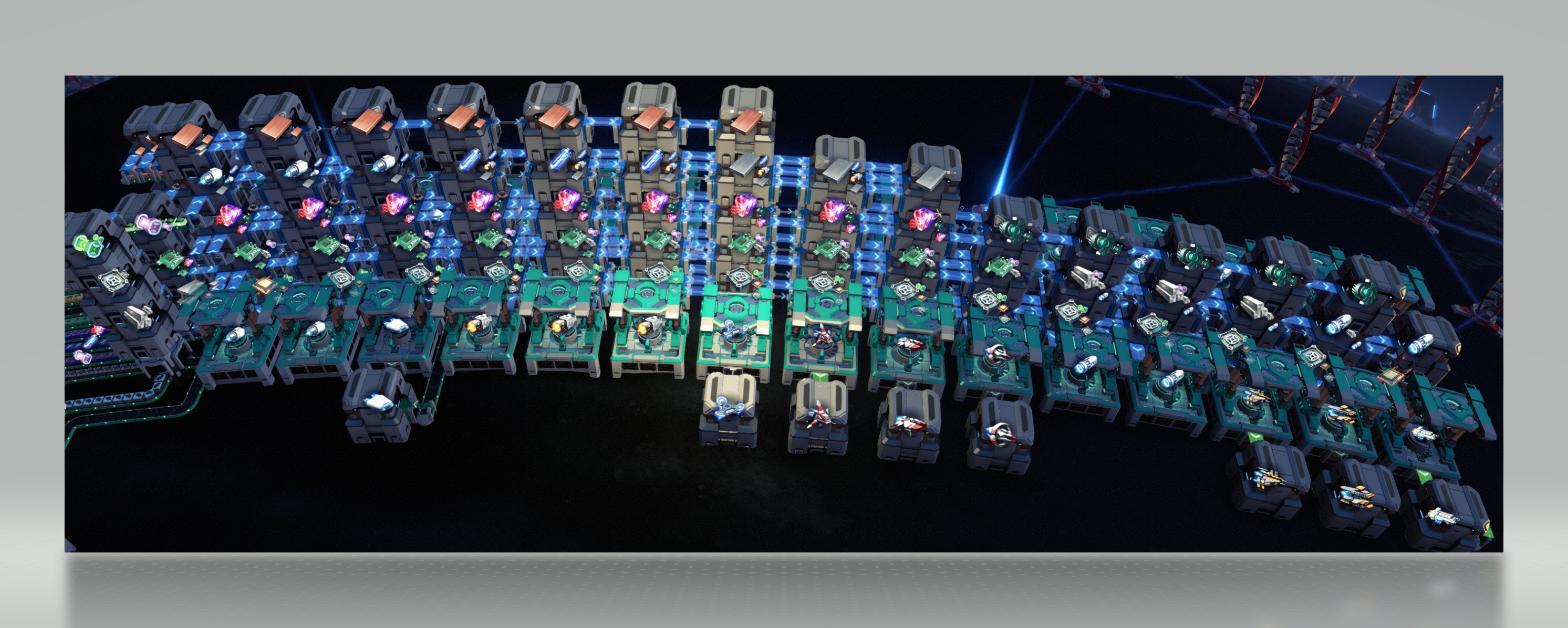 Builds every Vessel, from Fidget Spinner to Destroyer in an incredibly small Footprint. Logistics Drones and Logistics Vessel have 2 assemblers. Prototype Fighter has 3 but 2 are basically used to supply the Precision Drone and the Attack Drone. It will buffer alot of material and it will take a while until it boots up. Uses a 13 "belt" input so 2 PLT (planetary) and 1 ILT (interstellar) Tower are required to import/ships all the material. But if you want to be on the safe side use 3 ILT. To export the ships interstellar you need 2 additional ILT because it is 8 types of ships. Point of note, the speed of the factory is highly dependent on the type of sorter. I do not recommend downgrading the sorters to T2. You can forgo the spaceships, especially the destroyer which uses frame material and strange matter. You can already build the factory when you have the prototype fighter and the interstellar tech unlocked as those tech stages will also bring all the tech needed for the thrusters and engines that are included in the shipyard.