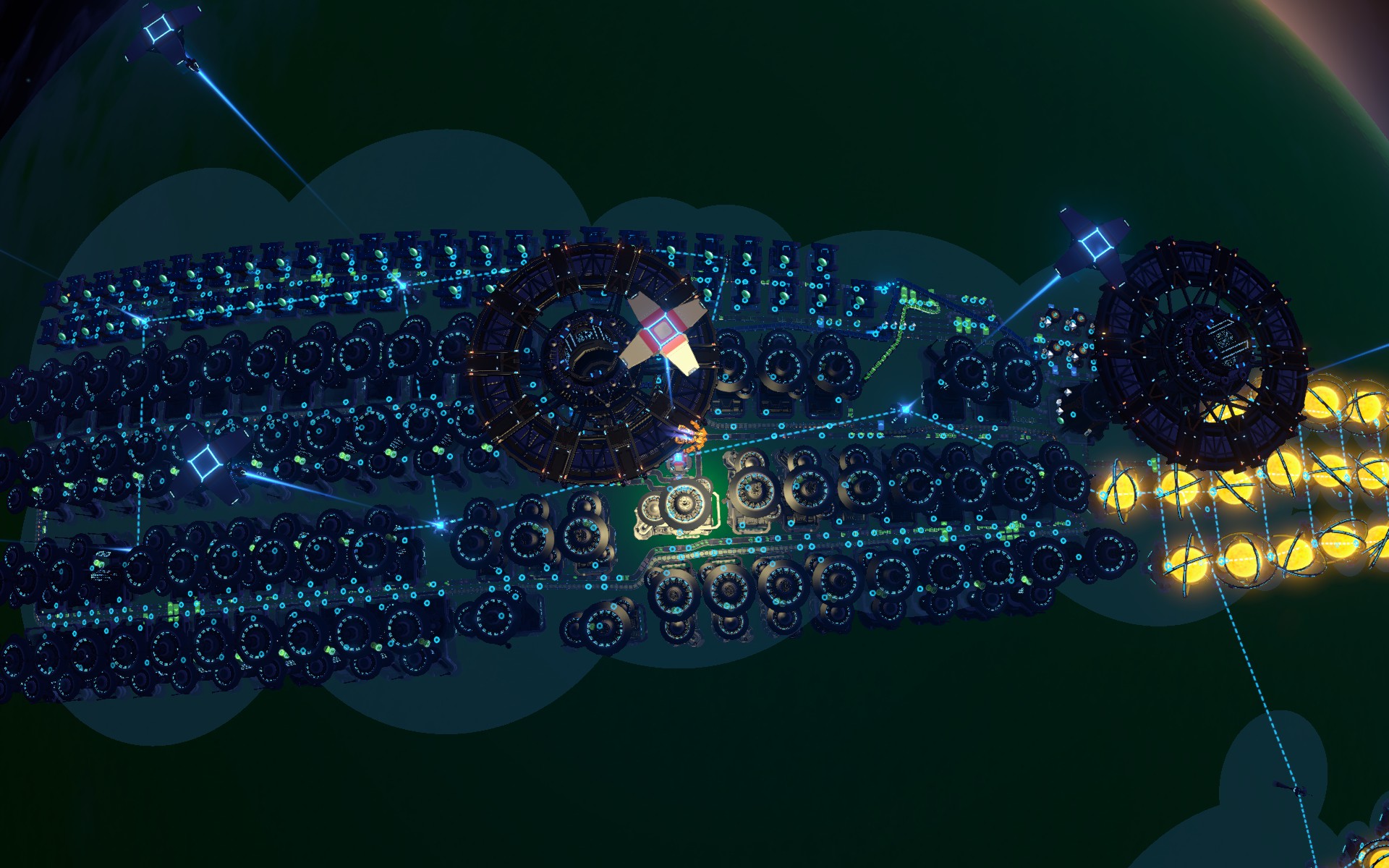 855/m grav lenses, 40 per planet, includes power, requires Particle Containers. 18 degree wide, from 0 to 62 meridian. Implements +prod receipt. Use when particle containers are made with basic receipt (not UMs). production chain