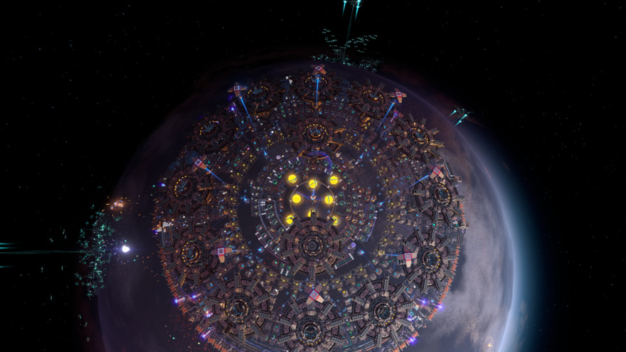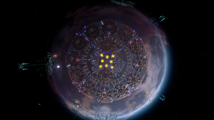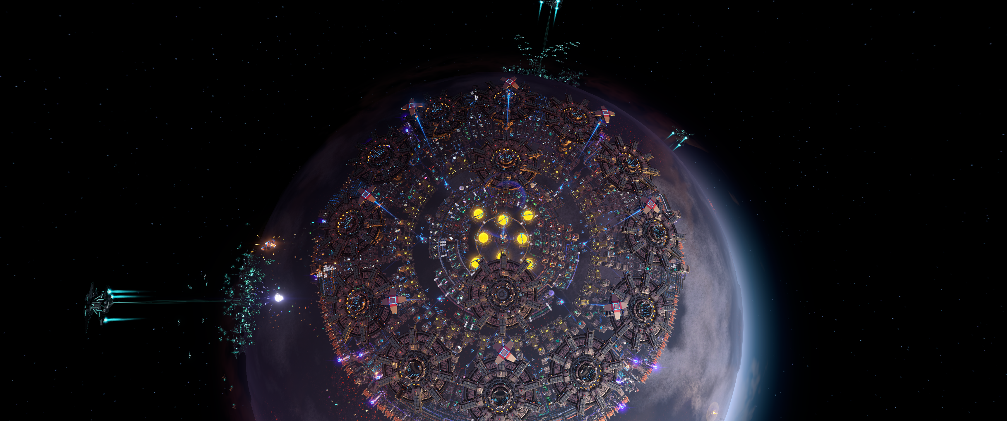 A polar dark fog farm that combines @defaultnano's sorters and @alphazulu489er's corralled ILS towers, but the reverse direction of @japaroads' version: It is enclosed at the polar cap and reaches down to 61 degrees latitude. Defends with laser turrets, jammer towers, plasma cannons, implosion cannons, and gauss turrets, with a ring of missile launchers inside. Towers are set to retrieve the highest ammo level for each emplacement, but the factory will make it's own ammo after there are enough materials gathered. Proliferates ammo with level 3 proliferator once crafted, before being loaded (doesn't proliferate the items going into ammo construction). Also requires strange annihilation fuel rods though will probably work with antimatter rods, if you want to change the inputs. Requires maximum slope on belts and a LOT of logistics bots to transfer between the gathering storage and the ILSes (3780) and almost 10,000 level 3 belts. No jams as it doesn't work like a sushi belt thanks to @defaultnano's great design. Holds it's own against 9 level 30 dark fog bases, tested with weapon levels at 20.