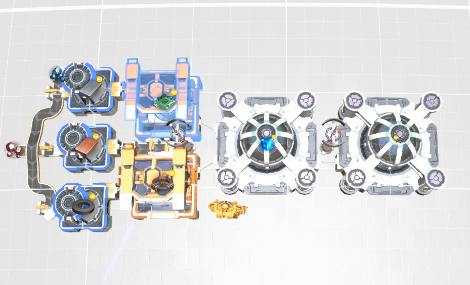 As the first step, this give you quick hands free blue cubes. It can be extended and stacked up to 3 layers. This will get you to unlock blueprint 300. See Step 2 for the next. --------------------------------------------- 这是一个为你快速自动制造蓝色方块的初始步骤。它可以扩展并堆叠最多3层。这将帮助你解锁蓝图300。查看第2步以了解接下来的操作。