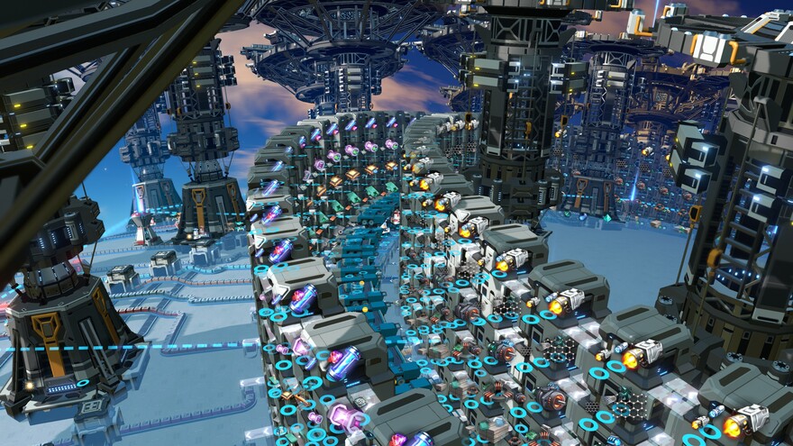 A late game mall based on filtered storage boxes, after a design by reddit user u/MonsieurVagabond.