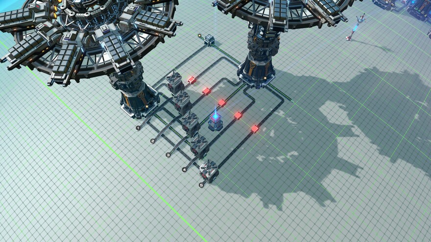 This tileable blueprint exports five buildings that are produced by your mall, but also imports them. This allows you to request a building on some remote planet you're working on, but then send any leftovers back to your mall.