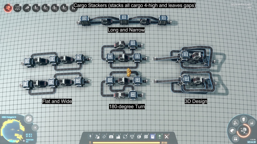 Each stacker takes any input of a single type of item and will output a stack of items 4-high leaving gaps on the belt.