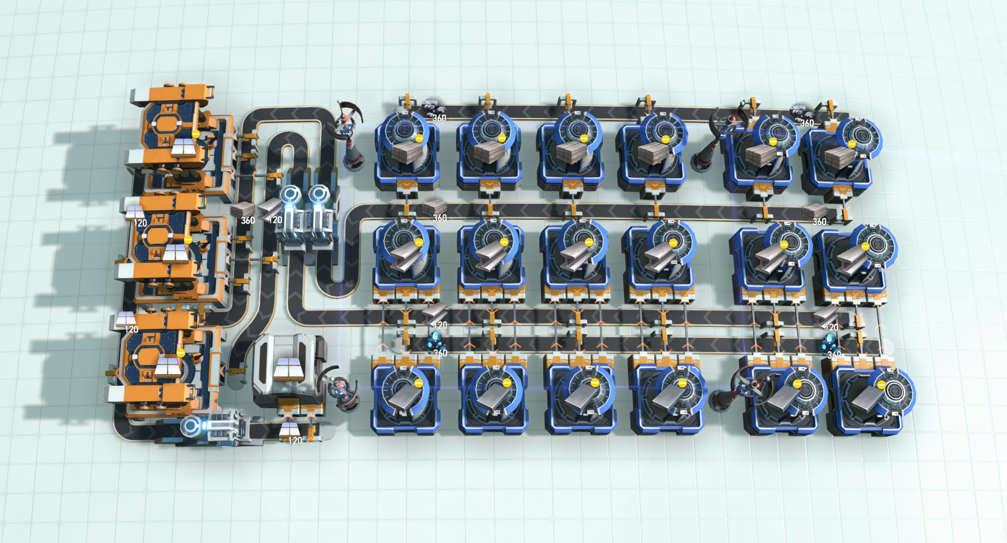 Produces 120 foundations per minute from 360 iron and 360 stone input per minute.