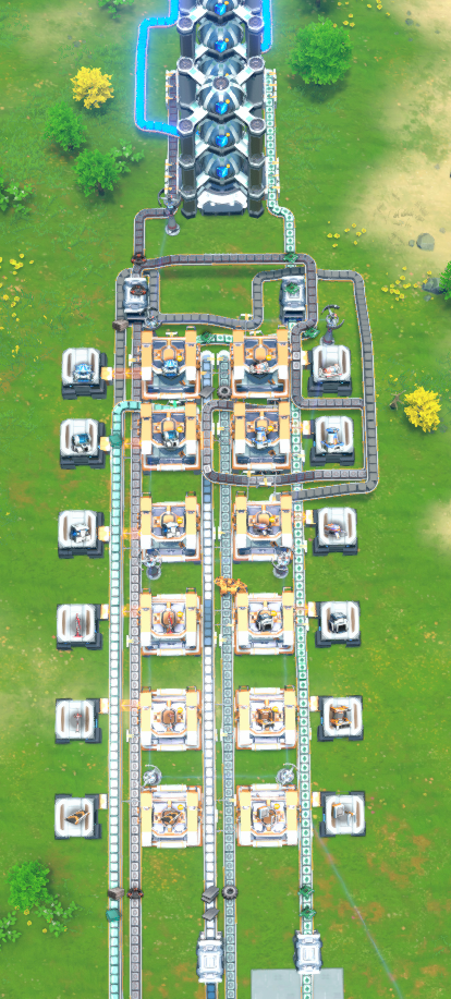 Starter Mall MK.1 - Part 1 of 3 Belts, Sorts; Assemblers; Tesla Towers; Turbines; Splitters Use stand-alone or add Part 2 for another 6 buildings. Kudos to a.b. who made this starter mall the other day, which I really liked but had a few issues with and inspired me to make this version. Thank you, a.b. This uses ONLY MK 1 components (I'm pretty sure anyway). Most MK1 storage are limited to between 1 and 3 stacks, except for belts which is allowed to fill up the whole thing. Needed inputs: Bricks: 1 smelter should do Glass: 1 smelter should do Iron Ingots: 3 belts worth, recommend 2 smelters per belt Gears: 2 to 3 factories, 1 smelter per factory (depends on how fast you want downstream products created) Circuits: 2 belts worth; recommend 2 factories, 2 iron smelters, 1 copper smelter Magnetic Coils: 2 factories worth; 3 magnet smelters