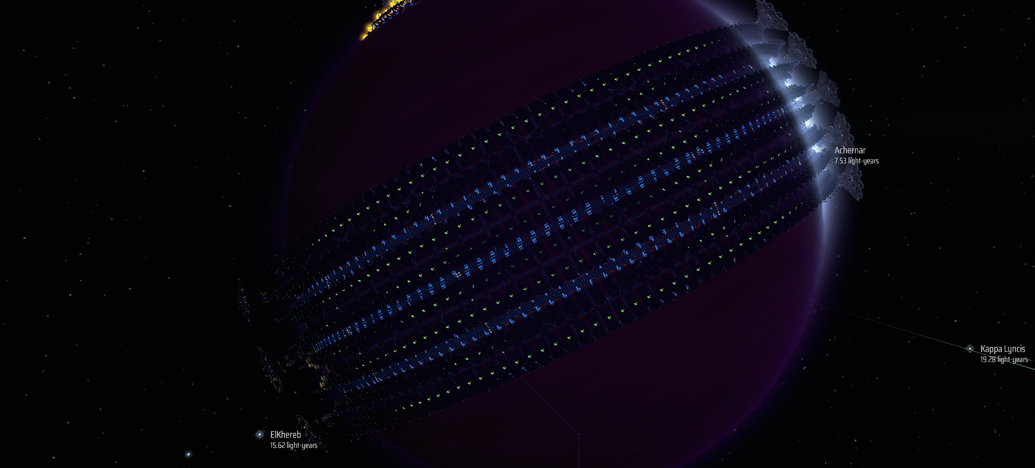 At full stacking and proliferation (set to speedup), this behemoth will produce 4 full (non-stacked) blue belts of Strange Matter for a total of 7200 pieces per minute sustained as long as you can keep it fed. This will require: