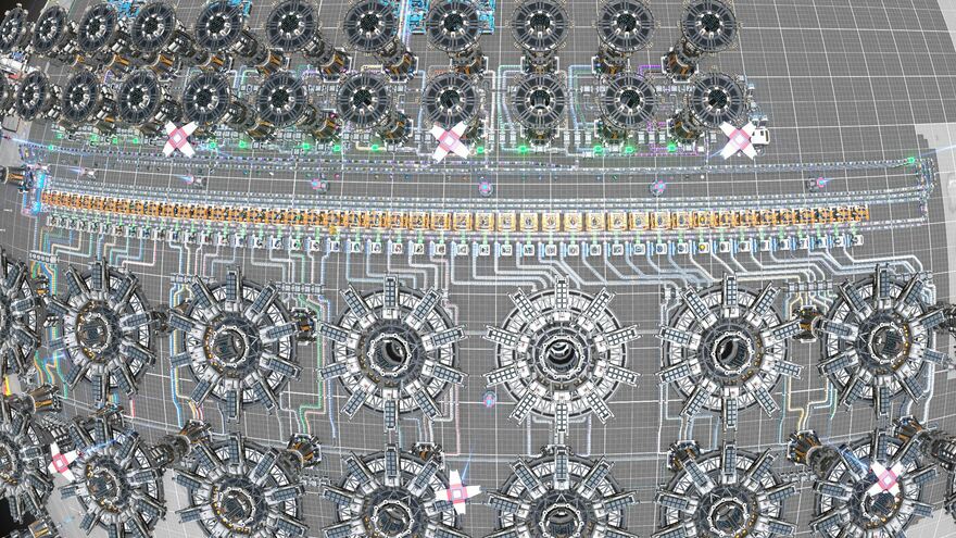 This mall is based on five sushi belts carrying every item needed to produce every building. Every belt carries 6 different items except the last one that carries 8. The top-most row of planetary logistics stations requests needed items from the network. Behind them is space to produce items that are not available in the network. It's demonstrated with gears, electric motors, annihilation constraint spheres and thrusters. The second row of PLS buffer items that are recycled from the sushi belts. The PLSes are organized in 4 groups of 4 each for the 6 item belts and one group of 6 for a 9 item belt which currently carries 8 different items. Every assembling machine pulls items from all five belts and cross-feeds the next assembling machine. That way, any building can be built anywhere. The output is stored in buffer boxes. Set the automation limit to your needs. Every building produced is then fed to an ILS that has its storage capacity set to the lowest possible value (100). That way, you can request buildings anywhere in the entire system 100 at a time. Adjust as needed. The second row of ILSes request buildings back, so you can simply send buildings back to your mall. Recycled buildings are sent to the supply ILS with priority. All ILSes are supplied with warpers, all items in the sushi belts are sprayed with proliferator Mk. III. on the top right and bottom left corners are storage boxes that are used to recycle items and buildings from your inventory.