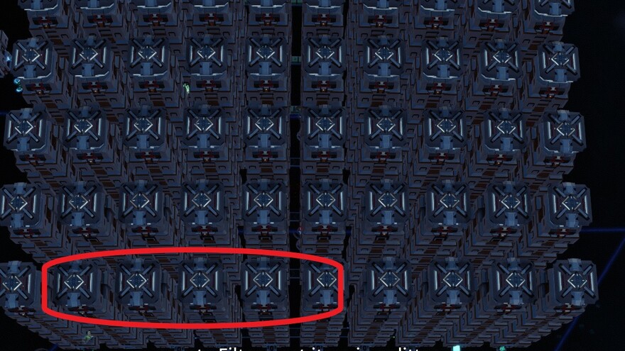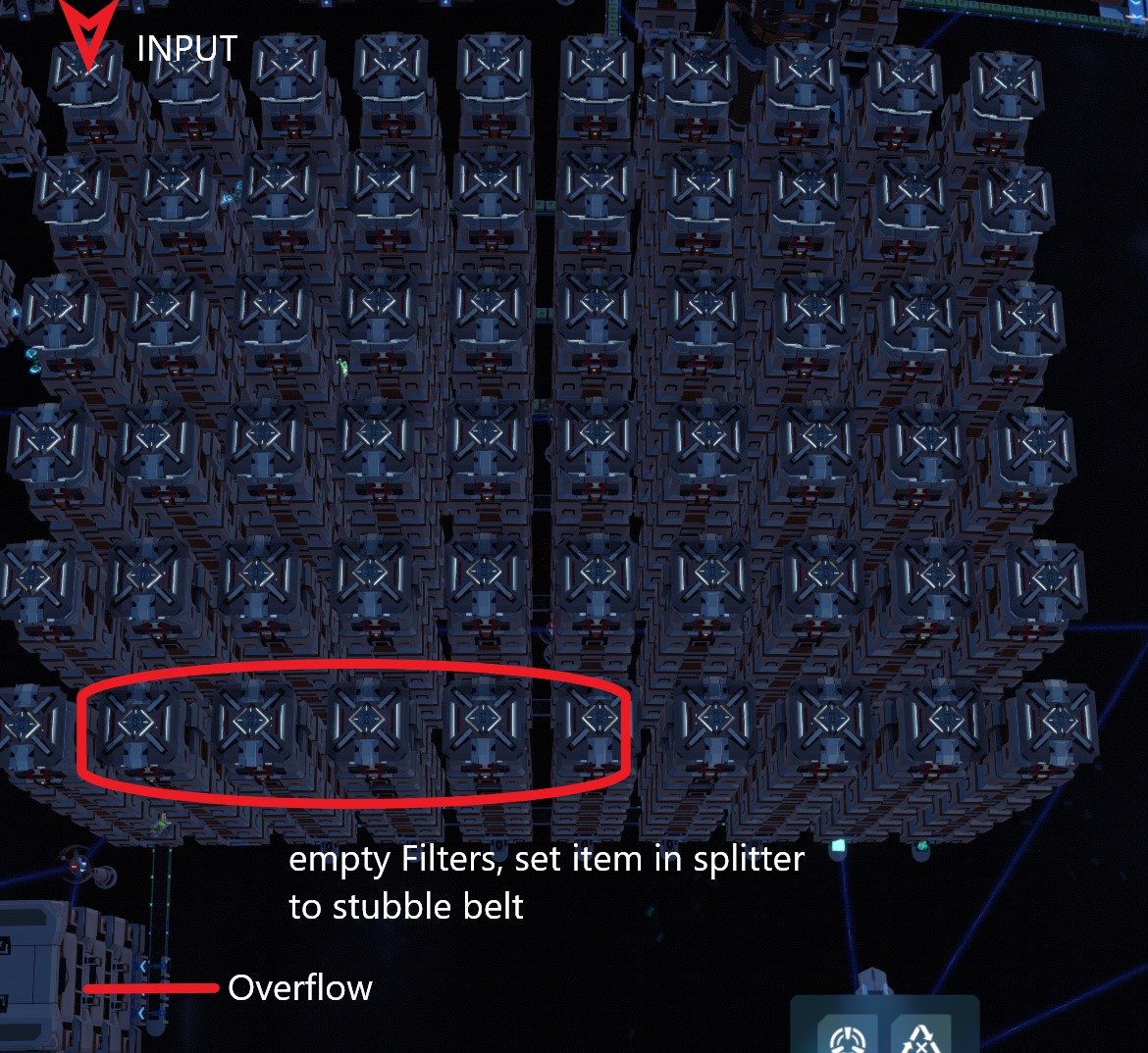 In case a filter is wrong or missing it will land in the big boxes, and there are spare slots in the "bottom row" on the output to set filters. The item you want filtered needs to be set to the stubble belt piece. That way when an item backs up there it will not go further along the belt but back up into the boxes above where a drone will pick it up.