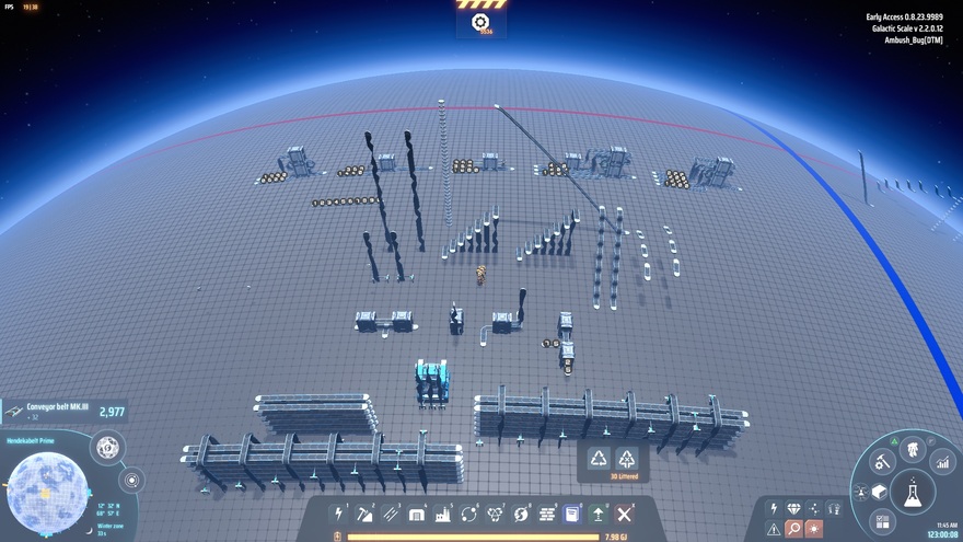 This is the parts yard I used for making the Hendekabelt mall. The main items of interest are the multiplexers. They're all labeled with belt icons to show the items/minute that will come out of the output side once everthing is hooked up. Do NOT upgrade or downgrade the belts for those when you place them, or the proportions will change. (Unless, of course, you're experimenting!) Try hooking up some of the plexers in sequence for more finely-grained proportioning!