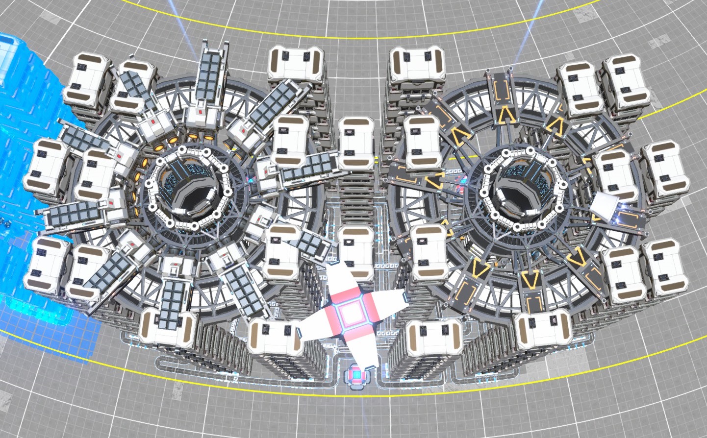 These are borg tiling compatible, made for the 25-block wide middle tropics. 192 large storage boxes per unit with 12 belts maximum throughput to load/unload.