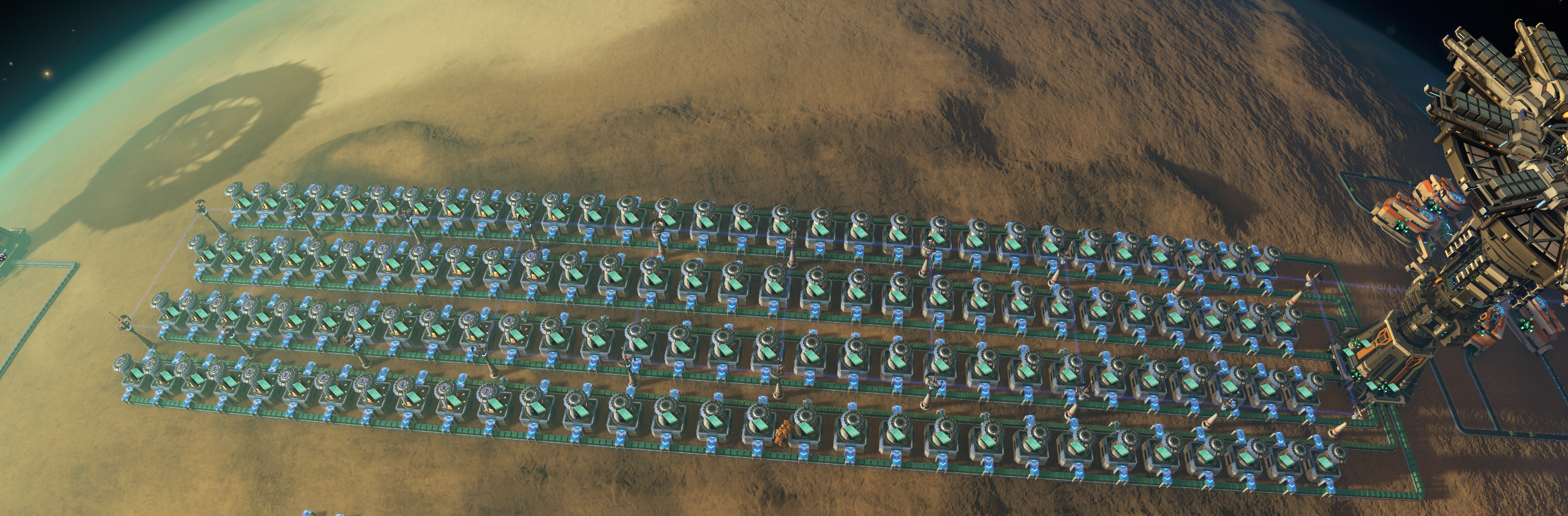 Basic Intergalactic tower, 30 smelters x 4.  I unit in, one unit out.  Can be used for any need where the input/output balance is maintained. For example, silicon is pictured here. 2 units/sec in, but with a 2 second craft time, it still works. THERE IS NO RECIPE SET.  Can be used for smelting iron, copper, stone, high purity silicon, silicon crystals, what have you. Just set up the tower for the proper in's and out's, and copy the recipes in. You can also mix and match.