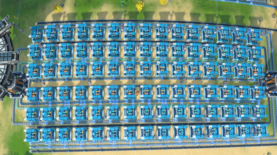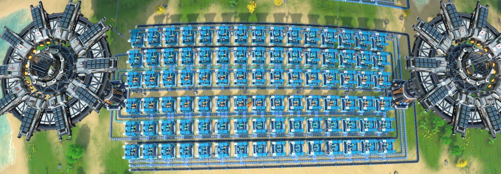 First tower supplies gears, iron and circuits for mk 1 assemblers and grapheen for mk 2 assemblers . The mk 1 assemblers are fed directly to the assemblers for the mk 2 assemblers . The other tower supplies processors for the mk 2 assemblers and particle broadband for the mk 3 assemblers. The mk 2 assemblers are fed directly to the assemblers for the mk3 belts. The mk 3 assemblers go to the second tower for distribution.