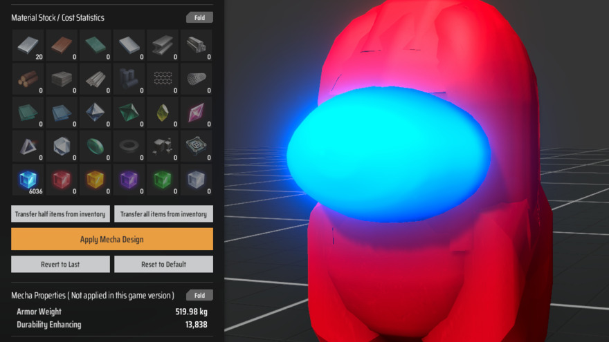 The red crewmate / impostor from internationally hit game Among Us mecha blueprint to to make Icarus be more Icarsus.
