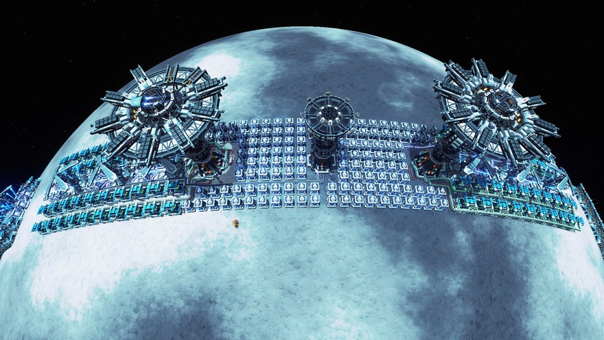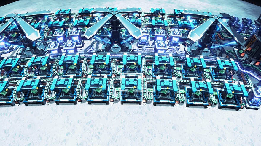 A combination power supply, power bank, and factory, 2-Input is a latitude-compacted factory with plenty of stacked belts to squish it all down. It has a 42.6 GJ power bank, which can supply 142MW for five minutes. 80 assmblers make short work of circuit boards, turbines, and other 2-ingredient items. It supplies 270MW from its 6 exchangers, plenty for factory operations with some left over for the E-ILS grid.