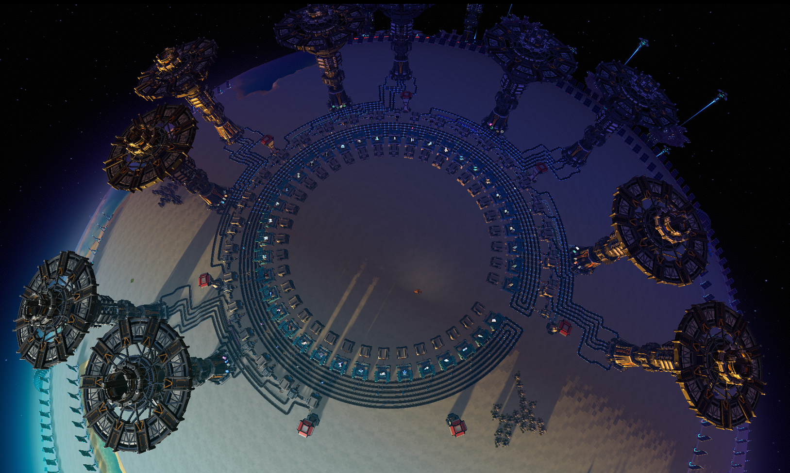 Towers for importing materials and exporting excess. Space to add another tower for more customization. Place cursor 30 spaces from the North Pole to space and align correctly.