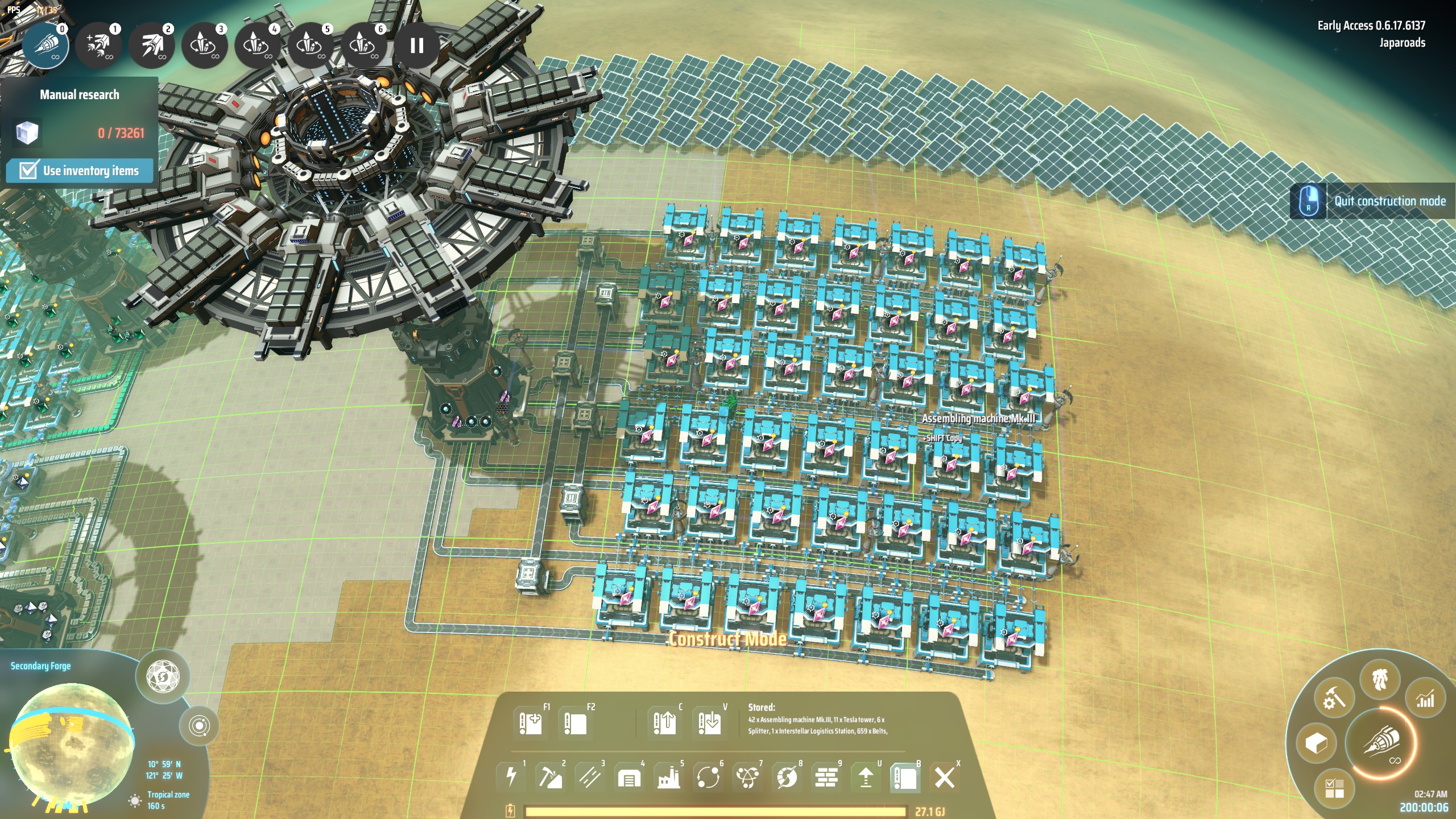 Optimized Casimir Crystal production. Unfortunately, there's no graceful way to deal with the leftover hydrogen on a belt after 6 assemblers have taken their fill, so the 7th assembler on each belt will flash on and off periodically--no way around it. Produces 17.5 Casimir Crystal/sec. Uses Optical Grating Crystals.