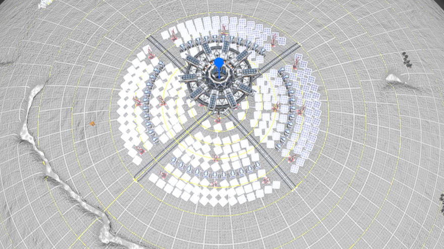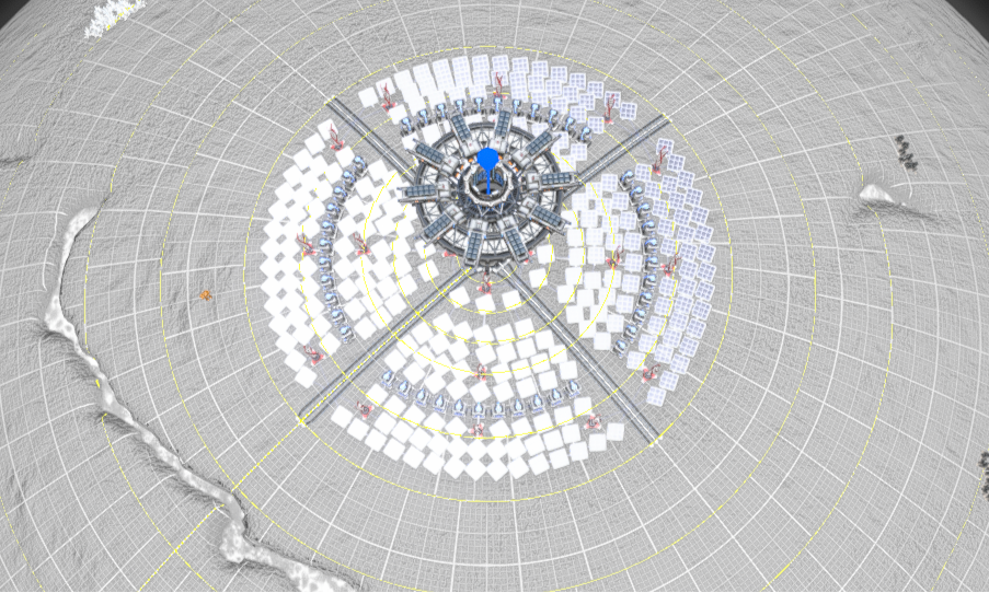 Easy solution to colonize planets and get extraction going and even small factories started anywhere without annoying OR ugly power issues. Can only be placed directly onto poles, aligning the middle belts with the big green lines. Make sure to pave away any ground issues before if you have issues placing. Don't forget your drones. Enough space to have 3 straight belts come in or out (default incoming here) Should net you 80-120MW of power depending on your planet.