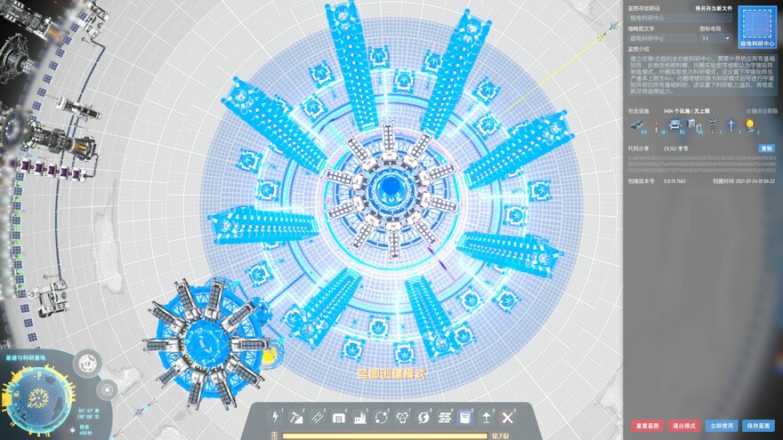 A fully functional scientific research center built on the N/S pole, requiring external supply of all basic Matrices, antimatter and fuel rods. Inner-circle lab towers are in Universe Matrix production mode by default, Outer-circle labs are in research mode, the upper limit of Universe Matrix production rate is 8/s under this setting; all basic research before Universe Matrix can be handled after the inner-circle towers are switched to research mode, the overflow of scientific research capacity under this setting will completely deplete the conveyor belt capacity of supplying basic Matrices.