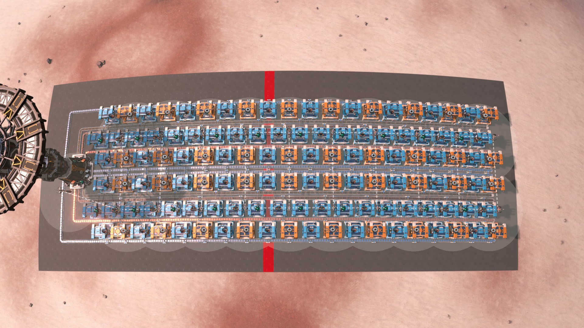 This layout has direct building transfers. No intermediate components are put back on the belts. All production of gears, magnetic coils, and electric motors is transferred between buildings. Smelted materials come off the input belts, and green motors are placed on the output belt. All assemblers are mk3 except for the gear assemblers (MK1).