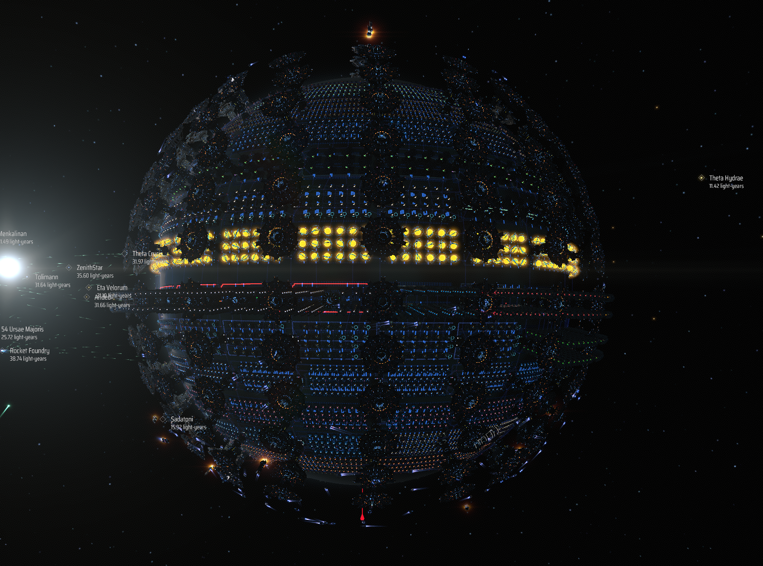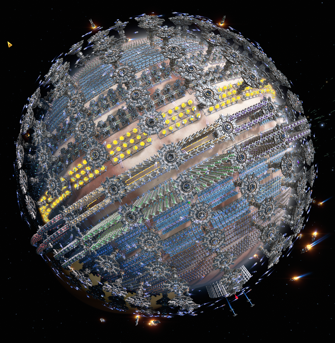A planet-sized factory that creates science from raw ingredients (plus Deuterium, which may or may not count as raw depending on who you ask). It's designed to be powered by artificial suns which are included in the design. Heads up: It uses logistics stations to transport materials between modular blocks, so it can take a while to fully saturate and reach full production capacity.