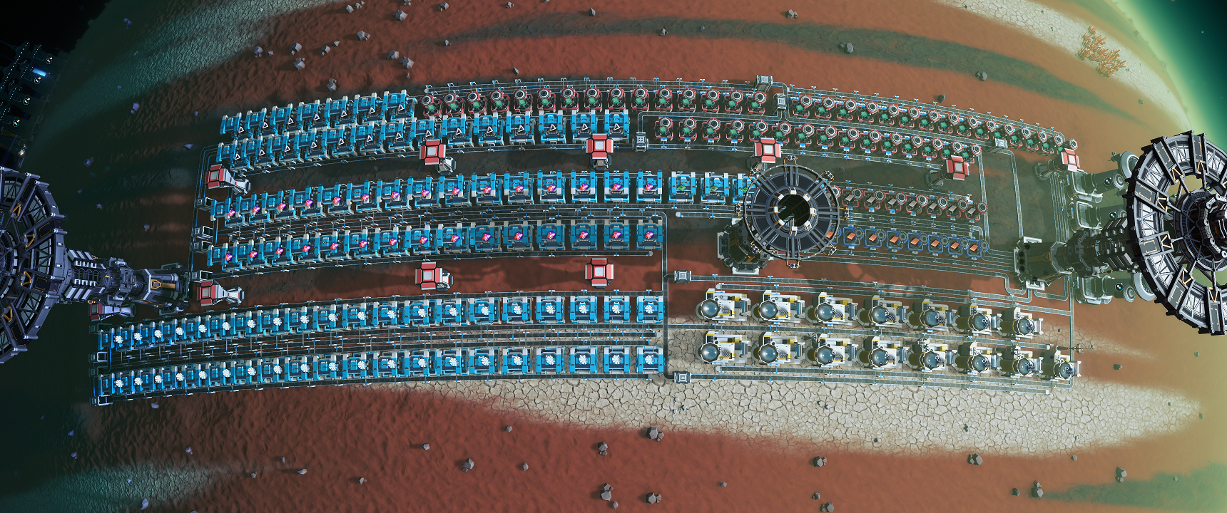 太阳帆总线型生产线,产量1800每分钟,长方形设计,使用了53个量子熔炉,大部分为基础材料,使用了可燃冰,未使用光栅石,无需本地物流小飞机,每星际物流塔10星际飞船即可。建议铺设在冰巨星星系中。 Solar sail bus-type production line. Output: 1800 per minute. Rectangular design, using 53 quantum furnaces. 10 Starships per Interstellar Logistics Tower. It is recommended to be laid in the ice giant galaxy. (Google Translate, please international friends work hard to understand LOL)