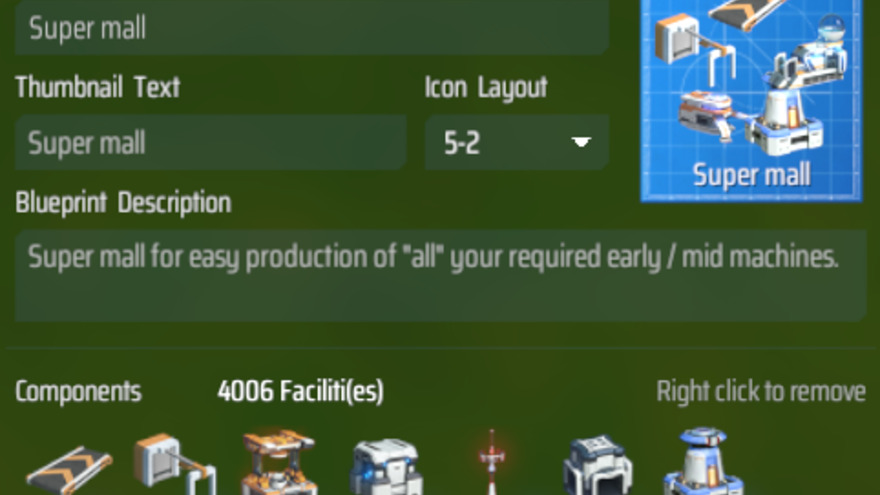 Super mall for easy production of "all" your required early / mid machines. Produces: - Assembling machine MK.I - Sorter MK. I - II - III - Splitter - Conveyor belt MK. I - II - Wireless power tower - Tesla tower - Oil extractor - Oil refinery - Mining machine - Thermal power plant - Arc smelter (MK. I) - Storage MK. I - II - Chemical plant - Matrix lab - Storage tank