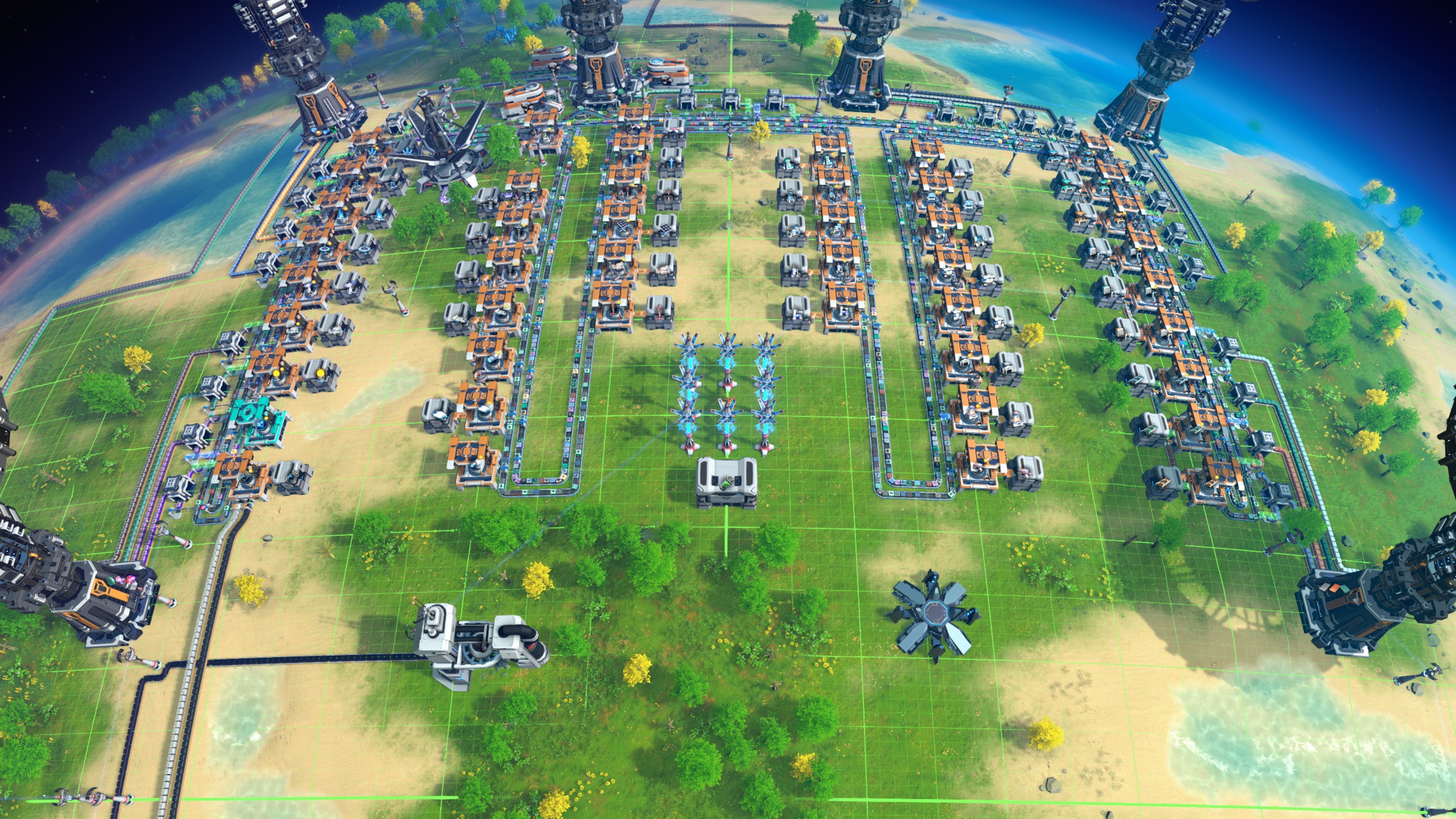 A thoughtful sushi mall designed by user DeathandGravity, from imgur. Implemented by me. It features 2 sushi belts holding 25 different items, pumped in from 6 ILS. With the correct sorter length and type you are able to fit 8 items on a heavy demand outer belt, and 17 items on a lower demand outer belt. The mall is designed to build every building in the game, plus antimatter fuel rods, from 2 sushi belts. Everything works correctly except when it comes to sorter stacking. This is due to the machine being full, and the sorter stack being full of the same item, not allowing it to grab any more of the items it needs off the sushi belt. This can be fixed by in 2 ways. The best IMO is just don't research sorter stacking at all. The second is to add a sorter with a filter to the specific thing it needs (due to the way the mall works, the item needed might not be on the belt at a particular time. If you can't filter it, wait a sec and try again). My design differs slightly from the original in the photo is 2 ways. The first is that there is an artifical star connected to some chest. This can be deleted. The second is a particle collider in the corner, to take photons into the antimatter and hydrogen for fuel rods. This I think should stay.